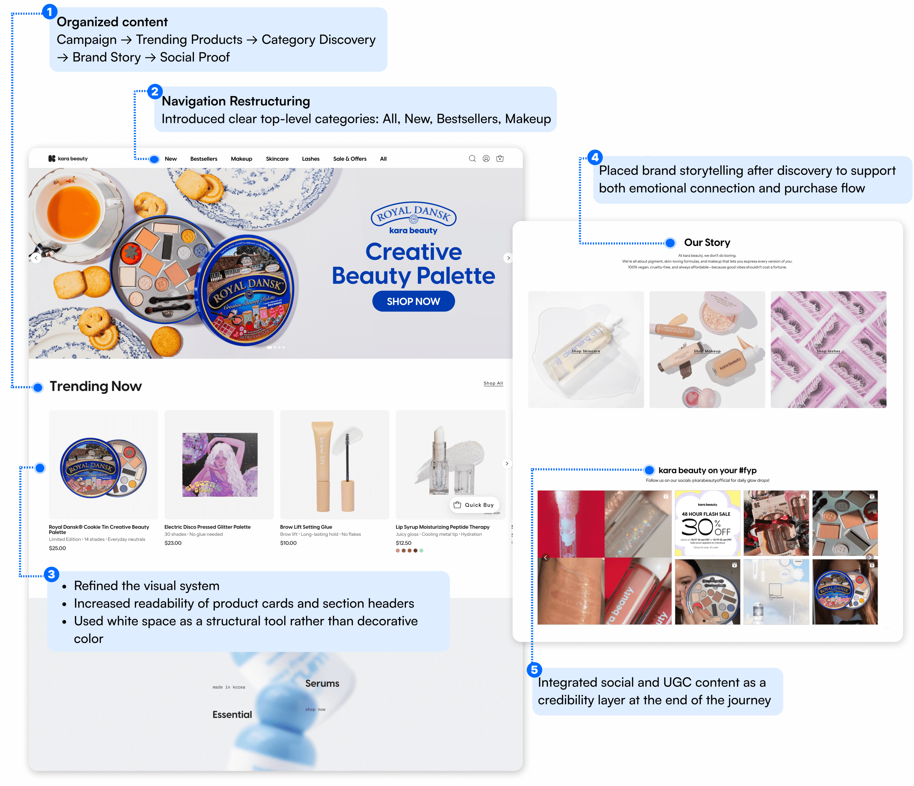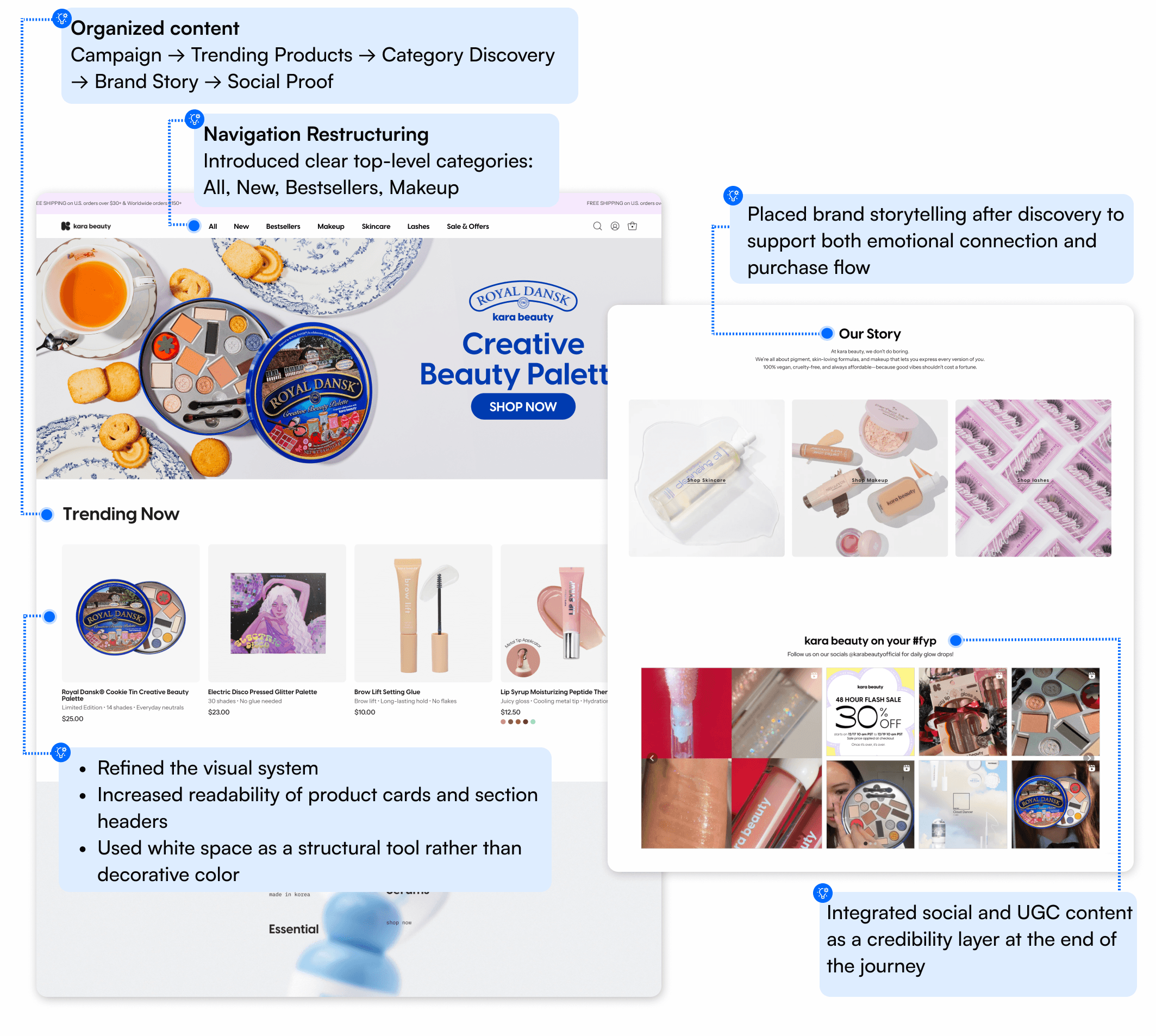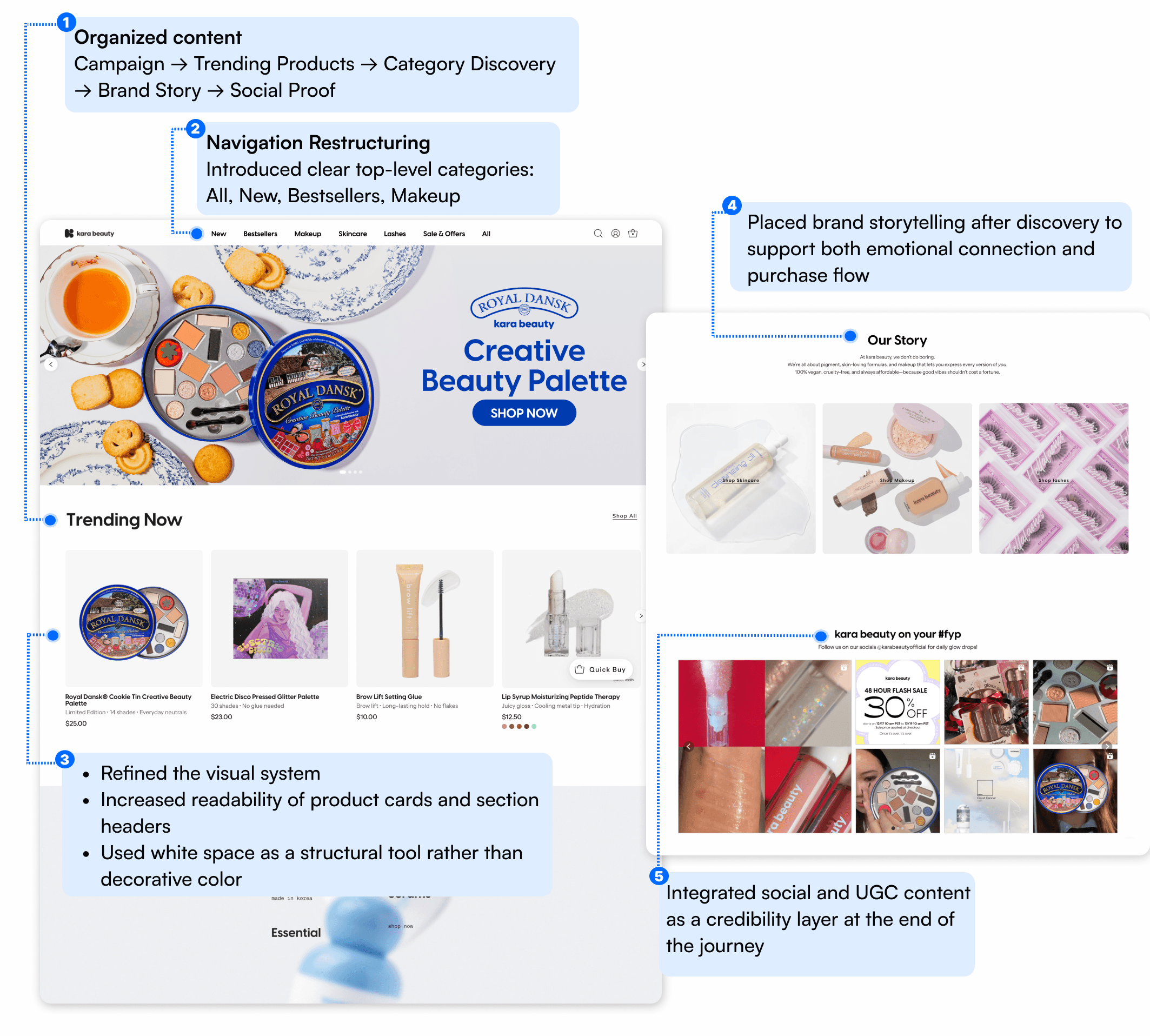 This is a full-scale UX Redesign of the Kara Beauty e-commerce website on Shopify, specifically focused on Conversion Rate Optimization (CRO). To maximize purchase efficiency, I identified critical friction points and redesigned the core user journey. By improving Information Architecture and clarifying the browsing-to-decision flow across the Homepage and PDP, I drove a 68% lift in overall site conversion rate.