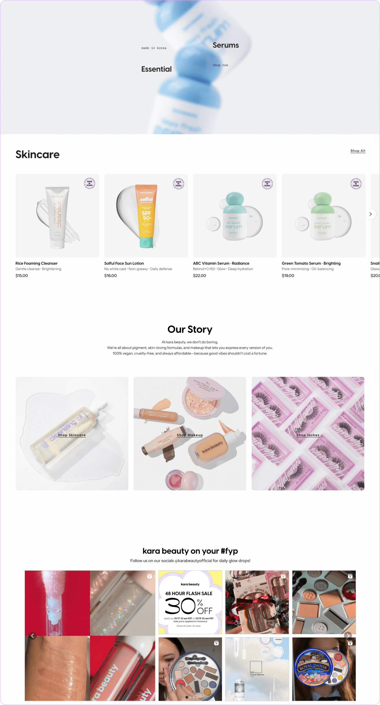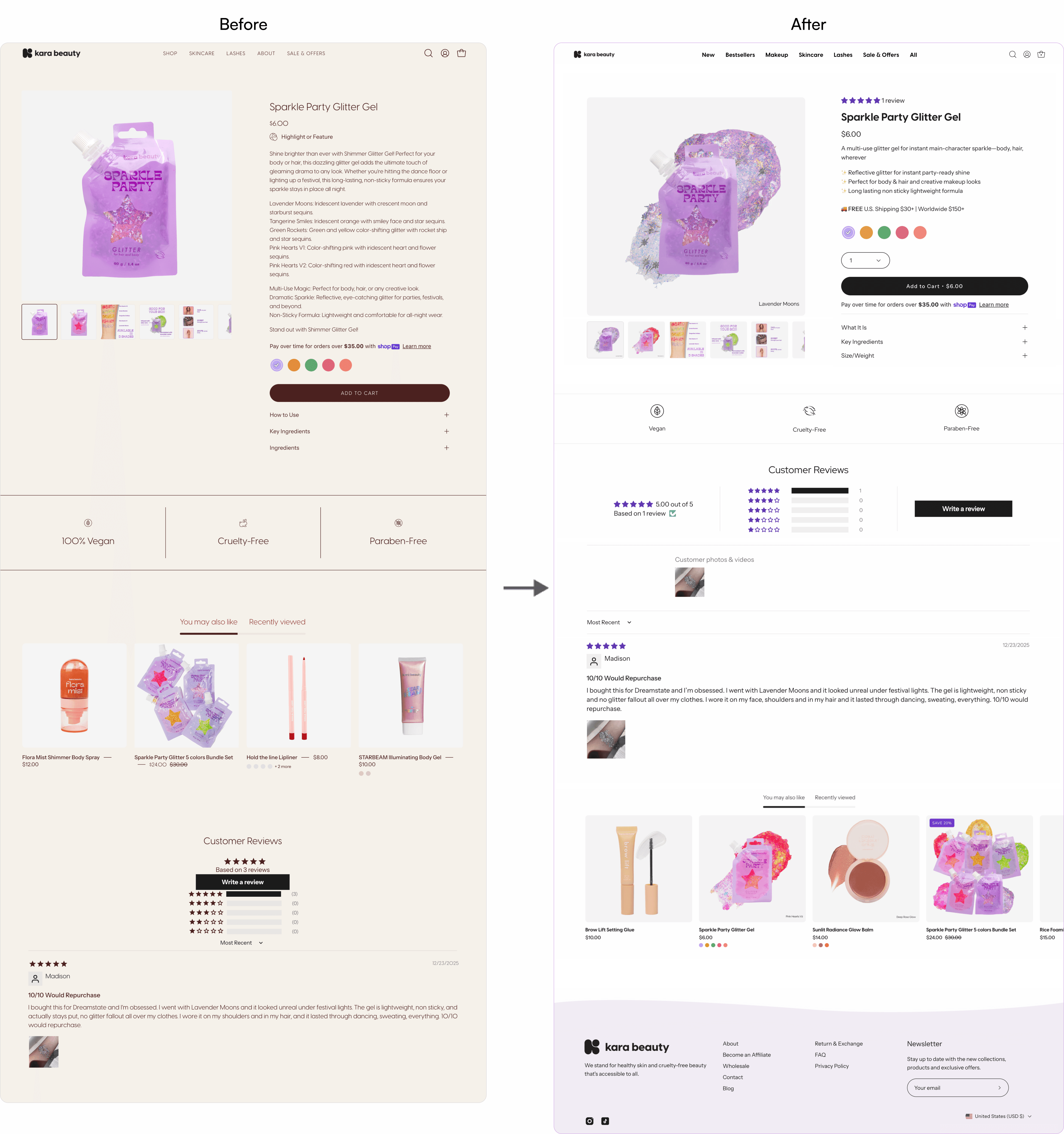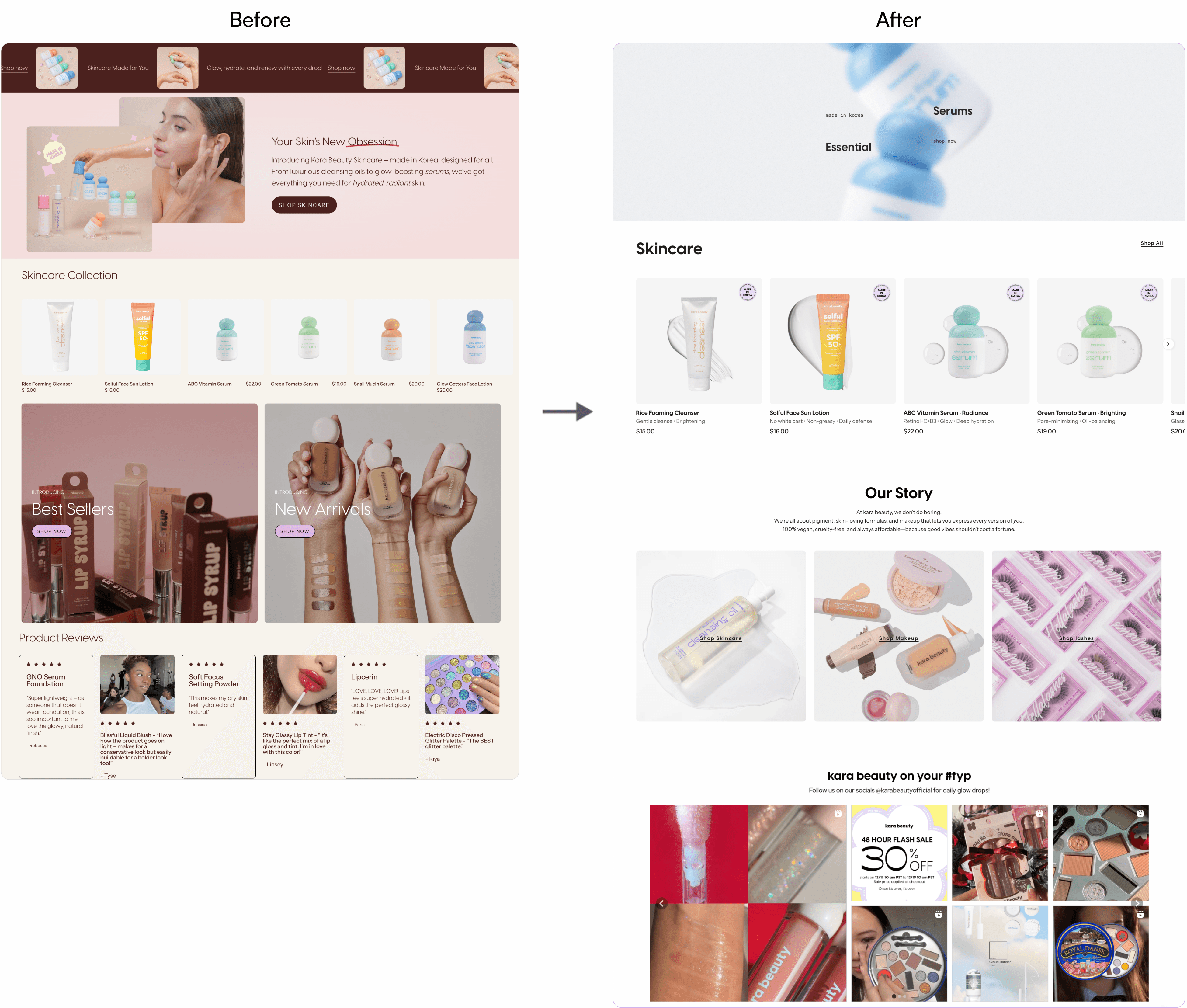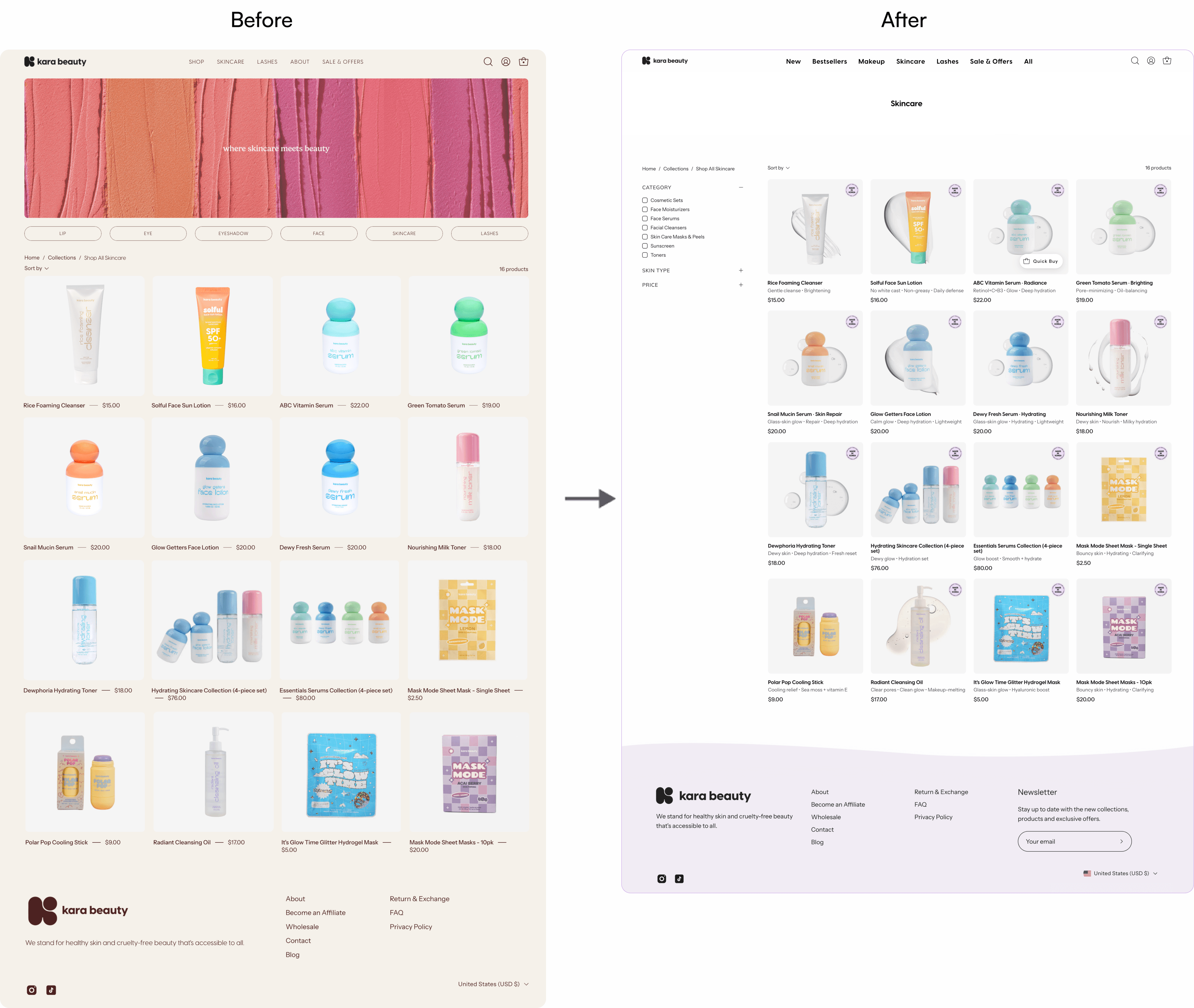 This is a full-scale UX Redesign of the Kara Beauty e-commerce website on Shopify, specifically focused on Conversion Rate Optimization (CRO). To maximize purchase efficiency, I identified critical friction points and redesigned the core user journey. By improving Information Architecture and clarifying the browsing-to-decision flow across the Homepage and PDP, I drove a 68% lift in overall site conversion rate.