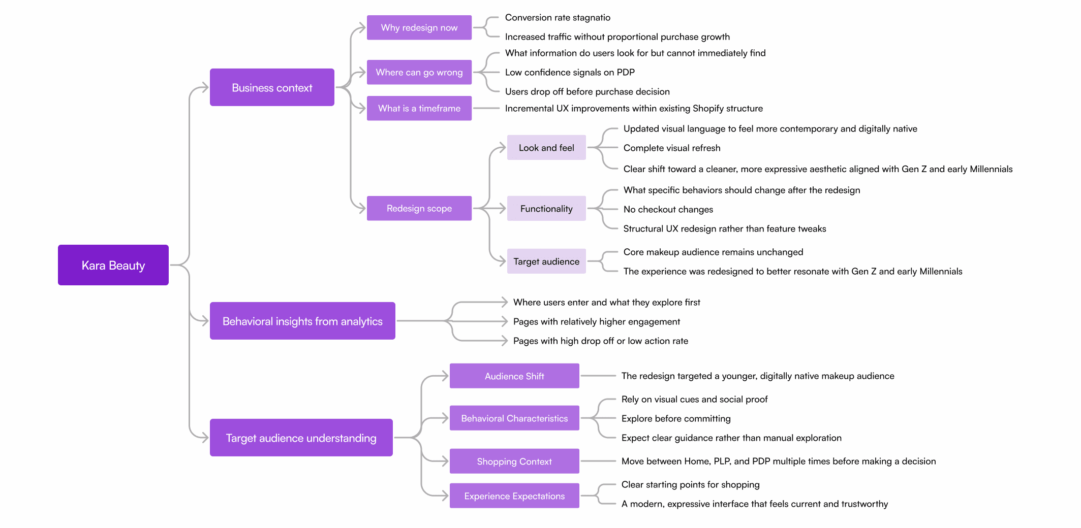 I used this discovery framework to structure how I understood the problem space before proposing any design solutions. This phase focused on framing the right questions based on business context and observed user behavior rather than jumping into redesign.