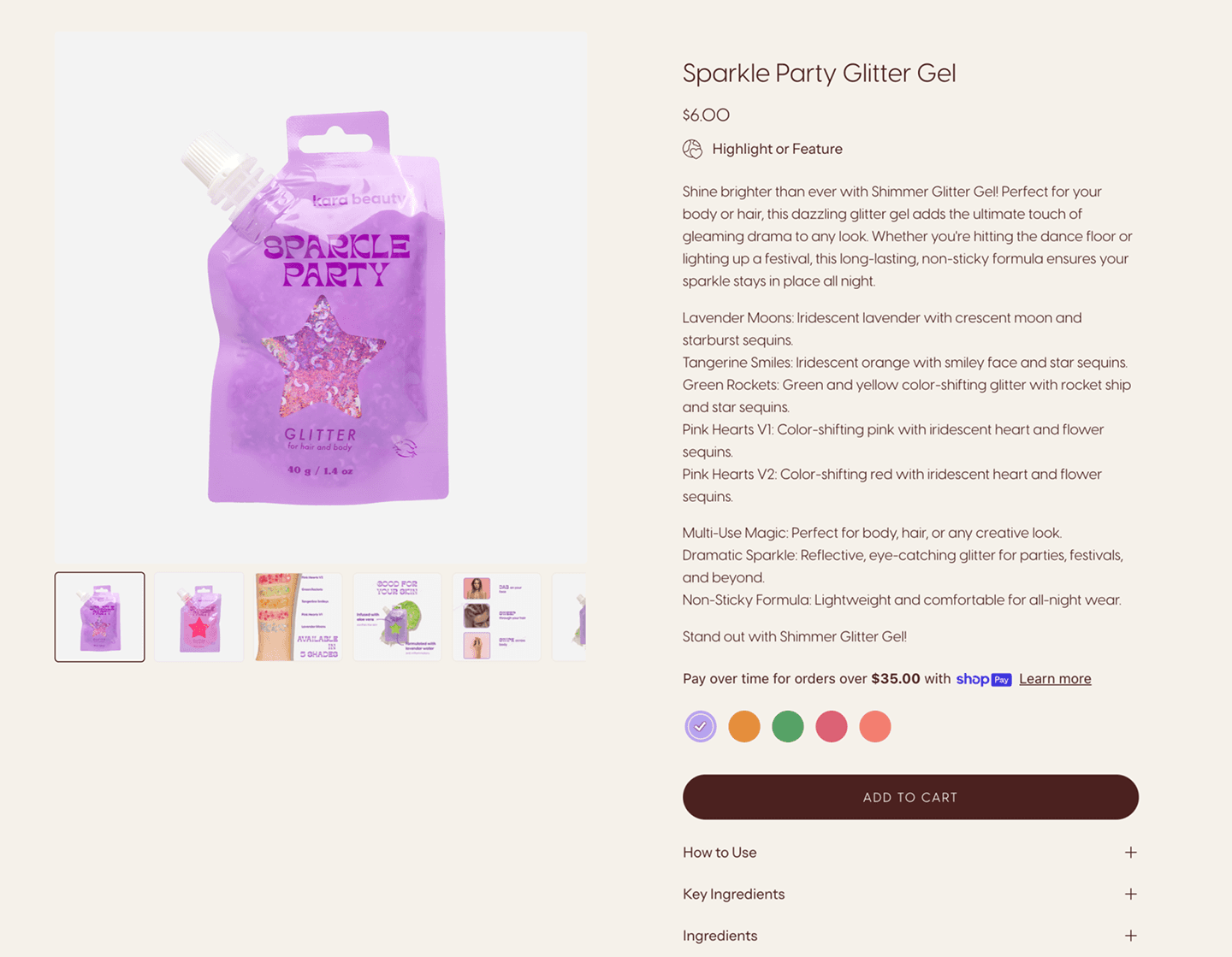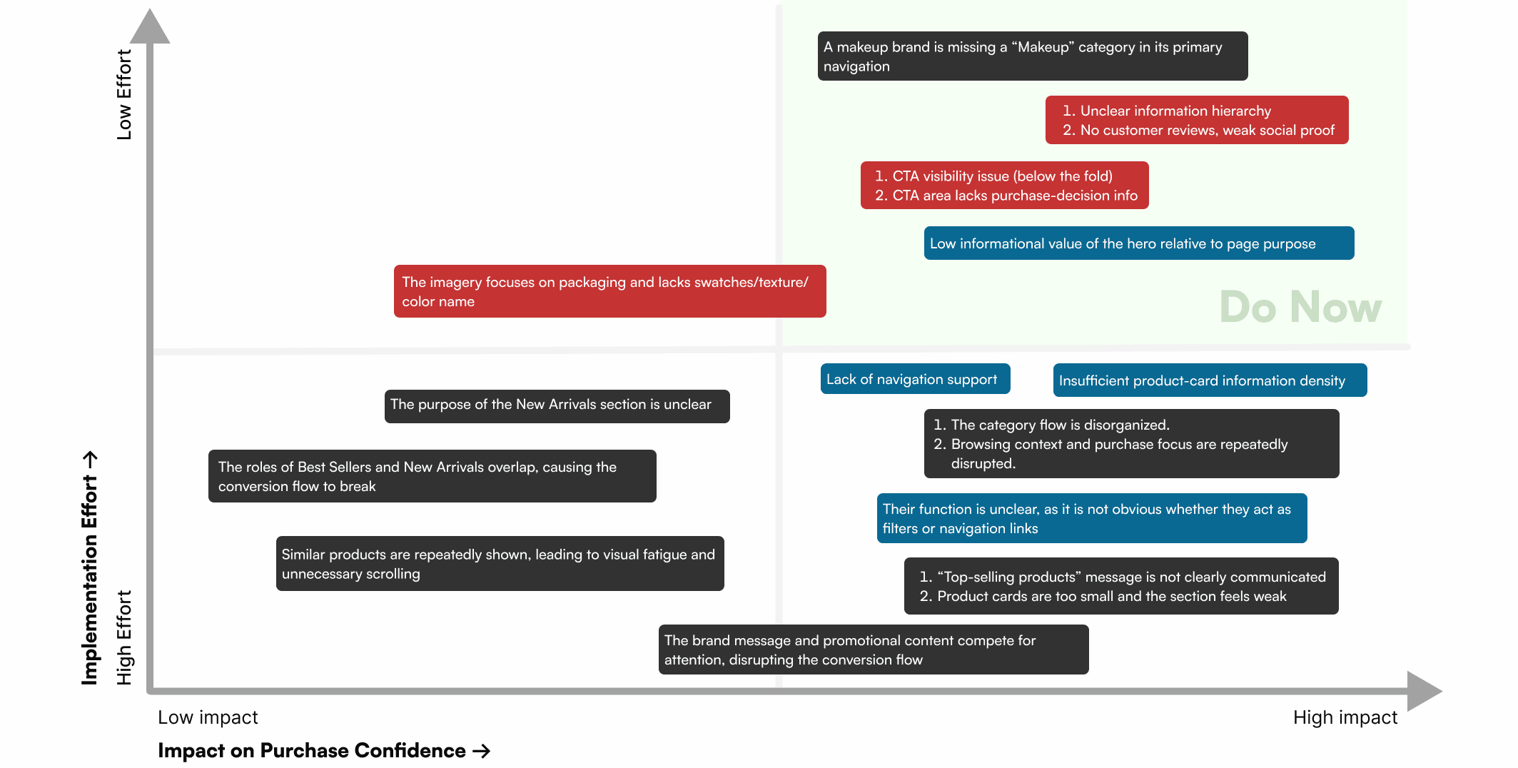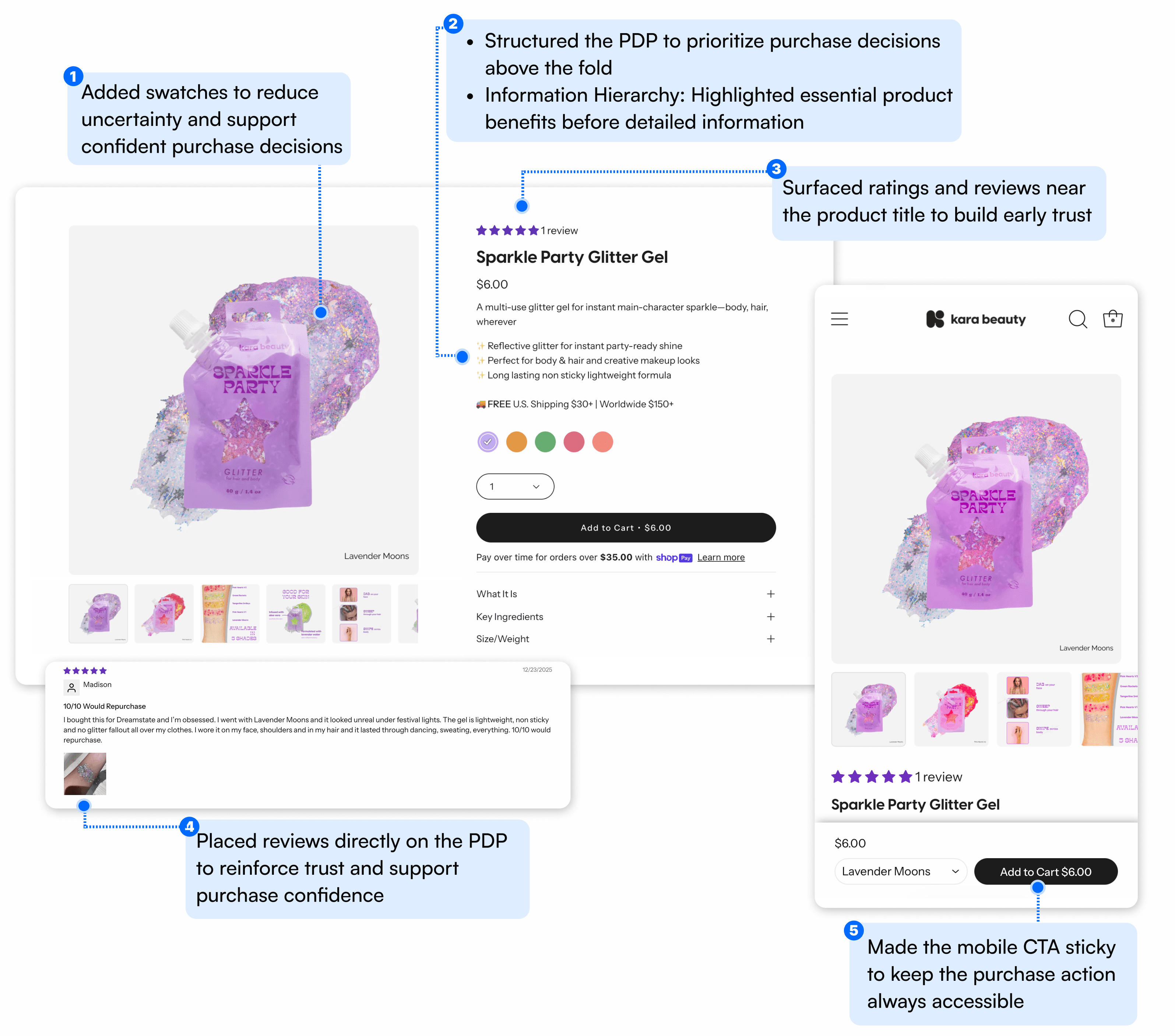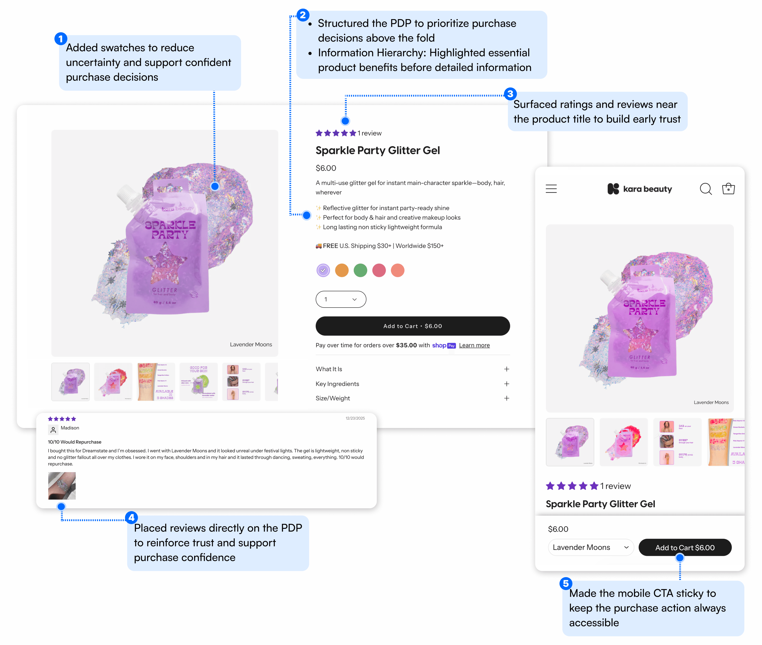 such as CTA visibility on mobile, review placement on PDP, and immediate access to product context like shades and benefits.